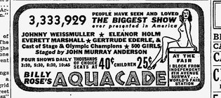 There were many spectacular performances at the Fair. Johnny Weissmuller of Tarzan fame appeared, according to Brooks Atkinson in the Times.